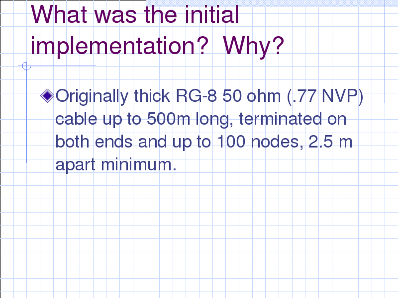 10BASE5 is the original Ethernet backbone, and is occasionally referred to as thicknet or thick Ethernet because of the thick 50 ohm coax that was used as the physical medium. 10BASE5 is a bus topology that uses transceiver cables to attach stations to the central 10BASE5 cable. Maximum segment length: 500 meters Maximum number of segments connected with repeaters: 5 (2500 meters) Maximum attachments per segment: 100 Minimum separation between attachments: 2.5 meters