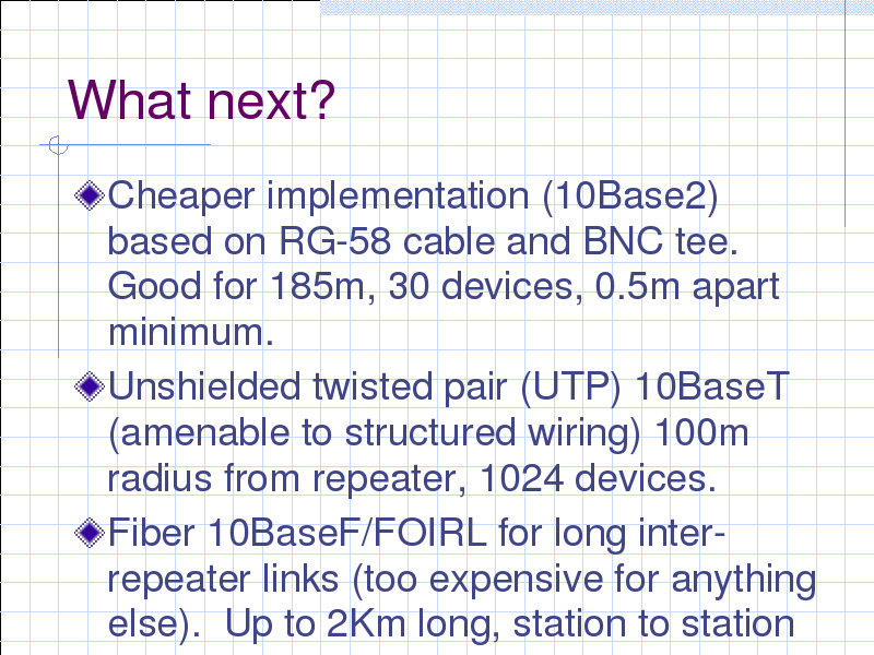 10BASE2 is designed as a smaller and less expensive alternative to 10BASE5, and is sometimes referred to as Thinnet or Thin Ethernet because of the much smaller cables. 10BASE2 is also a bus topology, but each of the workstations use a 'T' BNC connector to connect workstations to the central bus. Maximum segment length: 200 meters Maximum number of segments connected with repeaters: 5 (1000 meters) Maximum attachments per segment: 30 Minimum separation between attachments: .5 meters 10BaseF depends on the signaling technology and medium used but can go up to 2KM.
