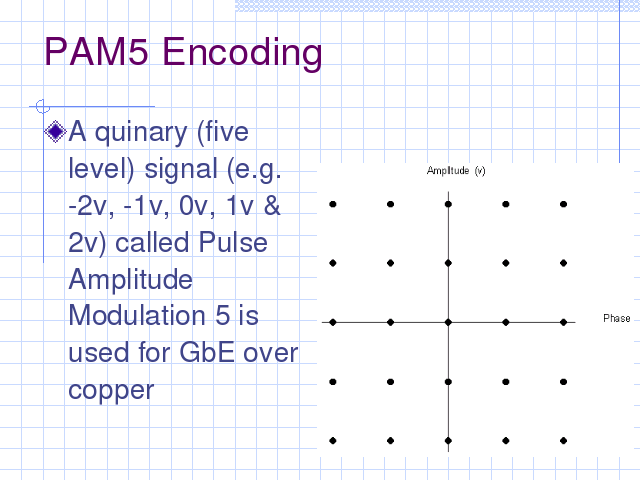 Sincee 4 separate pairs are being used for GbE there is a possibility of 5^4 = 625 codes to choose from when using all four pairs. Only four levels are really used for data, the fifth level (0v) is used for the 4-dimensional 8-state Trellis Forward Error Correction (FEC) code