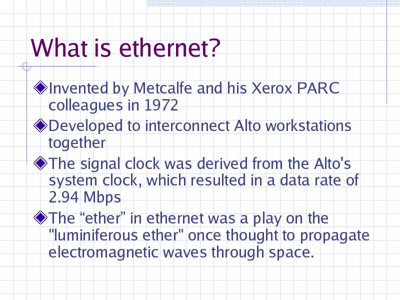 In 1973 Metcalfe changed the name to "Ethernet," to make it clear that the system could support any computer--not just Altos--and to point out that his new network mechanisms had evolved well beyond the Aloha system. He chose to base the name on the word "ether" as a way of describing an essential feature of the system: the physical medium (i.e., a cable) carries bits to all stations, much the same way that the old "luminiferous ether" was once thought to propagate electromagnetic waves through space. Thus, Ethernet was born.”