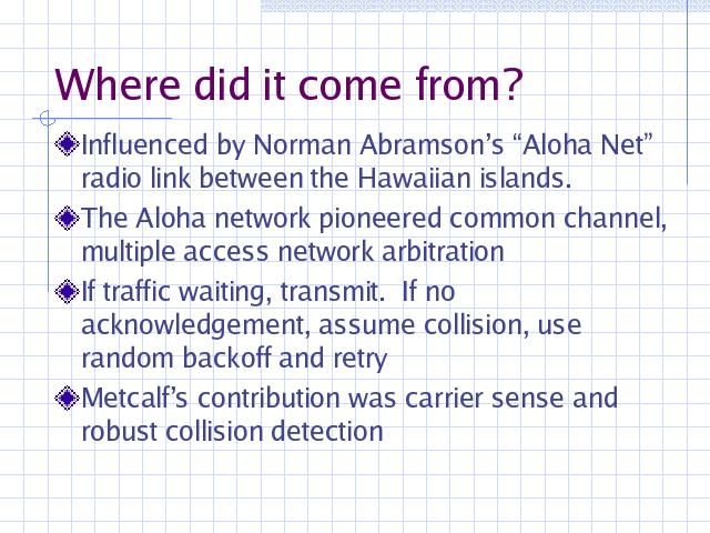 Metcalf discussed the issues explored in the Aloha network in his memo first describing ethernet. Norman Abramson’s group developed an inter-island communication system to experiment with mechanisms for sharing a common channel. The Alohanet was a shared radio channel, but the theory was applicable to other shared channels.