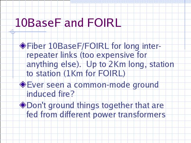 10BaseF, and its predecessor, FOIRL, are the only recommended topologies for inter-building links. However, they need not be limited to this role. 10BaseF can also be run to the desktop, though the cost is prohibitively high in all but the most specialized environments (generally, extremely noisy manufacturing facilities, or very security-conscious installations). More commonly, FOIRL (and now, 10BaseF) is used inside buildings to form backbone networks and to connect wiring closets together.