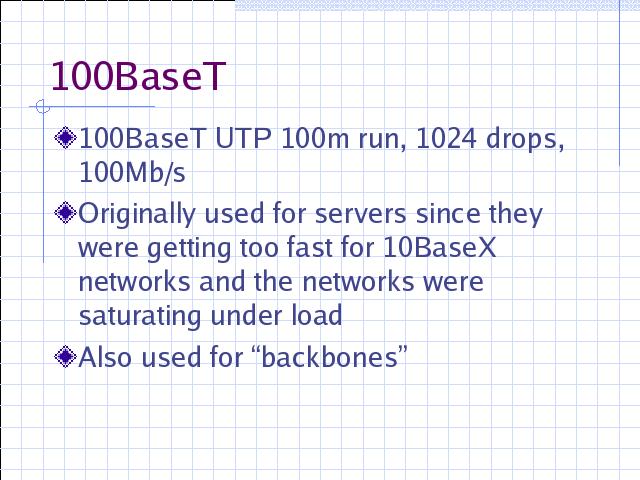All 100Base standards use 4B/5B encoding. The UTP standard sends at 125 Mbaud, three signal levels on copper (multi-level threshold-3 [MLT-3]) at zero to plus/minus 1V differential. The additional symbols available in the 4B/5B with MLT-3 are used to carry additional control signals link "IDLE", "JAM", etc. TIA/EIA Category 5 cable is required to avoid cross-talk and attenuation problems, even within standard lengths.