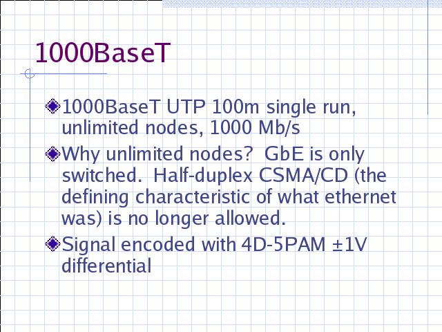 1000BaseT physical implementations (PHY) require sophisticated digital signal processing (DSP) to perform Near-End Crosstalk (NEXT), Far-End Crosstalk (FEXT), and signal equalization to compensate for distortion from the UTP wiring.