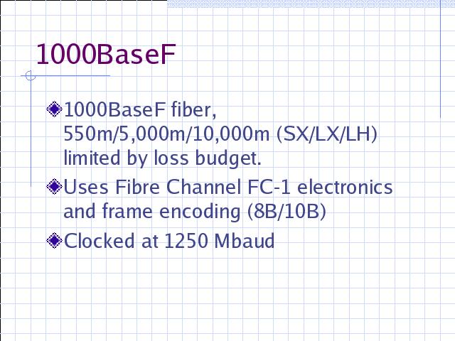 1000BaseFx uses 8B/10B ANSI X3T11 Fibre Channel FC-1 frame encoding, serializer/deserializer (SERDES) and NRZ on the fiber, clocked at 1250 Mbaud.
