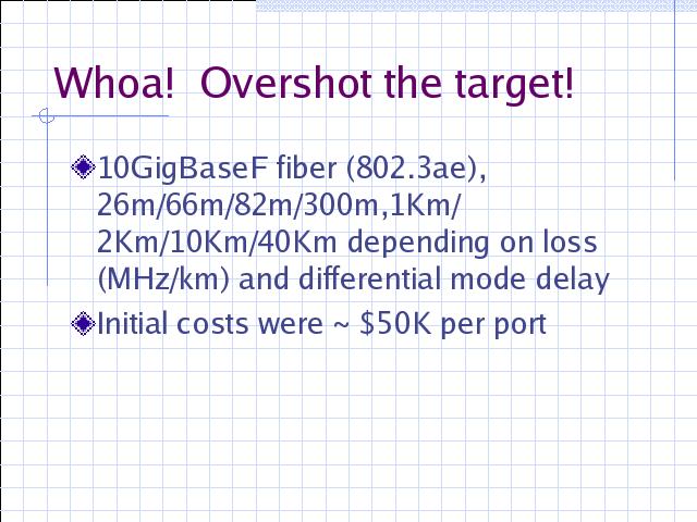 the standard specifies that multimode fiber is capable of transmitting at 10 gigabits/second over 82 meters using standard 50-µm fiber with minimum 850-nm bandwidth of 500 MHz·km; 66 meters using 400 MHz·km 50-µm fiber; 33 meters using 200 MHz·km; and 26 meters using 160 MHz·km 62.5-µm fiber. Distances up to 300 meters are possible with the new 50-µm 850-nm laser-optimized multimode fiber described here.