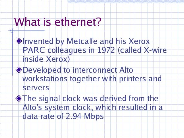 In a memo dated May 22nd, 1972 Bob Metcalf described the ethernet network system he had invented.. Metcalfe and his Xerox PARC colleagues developed the first experimental Ethernet system to interconnect the Xerox Altos to one another, and to servers and laser printers. The signal clock for the experimental Ethernet interface was derived from the Alto's system clock, which resulted in a data transmission rate on the experimental Ethernet of 2.94 Mbps. Metcalfe's first experimental network was called the Alto Aloha Network.